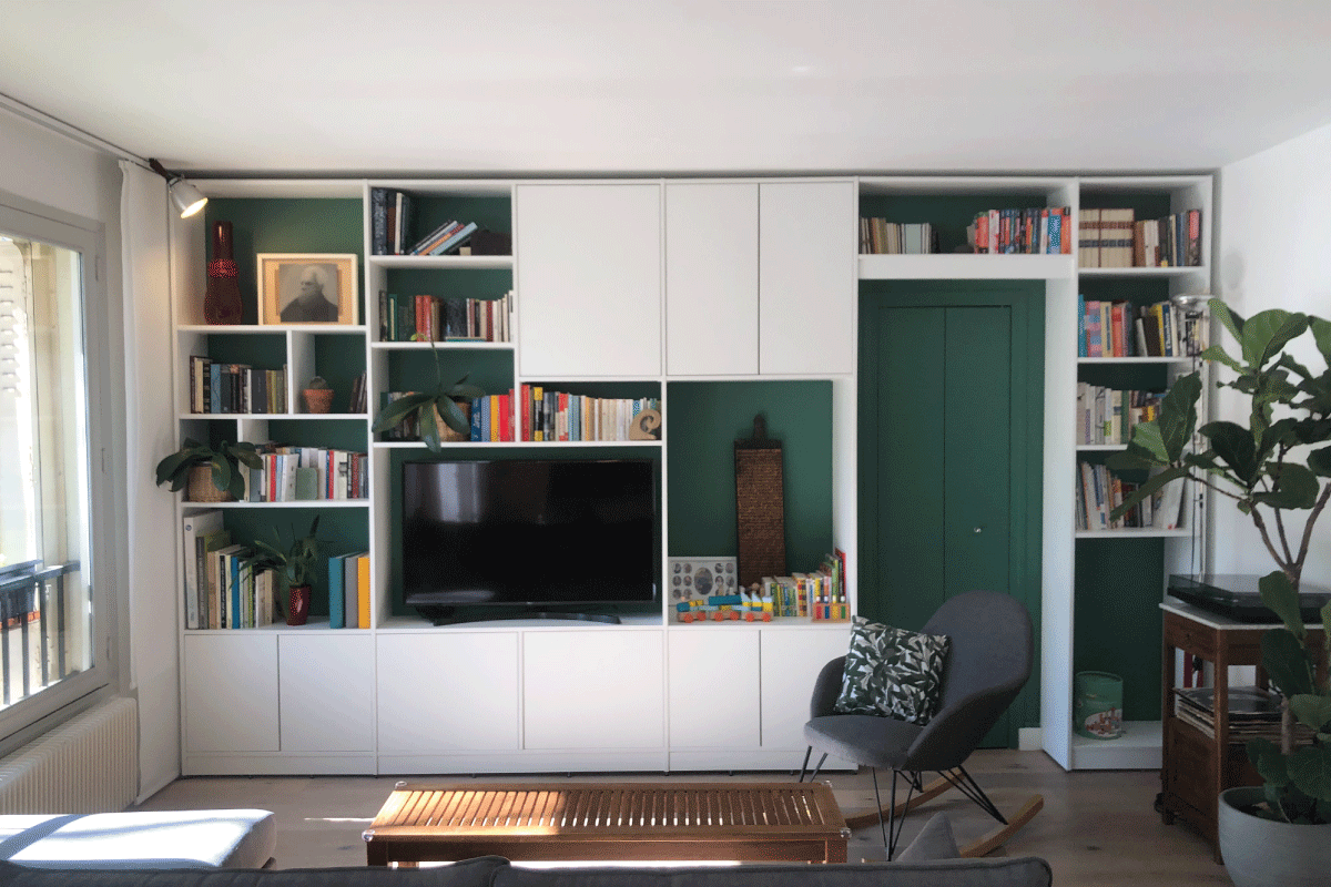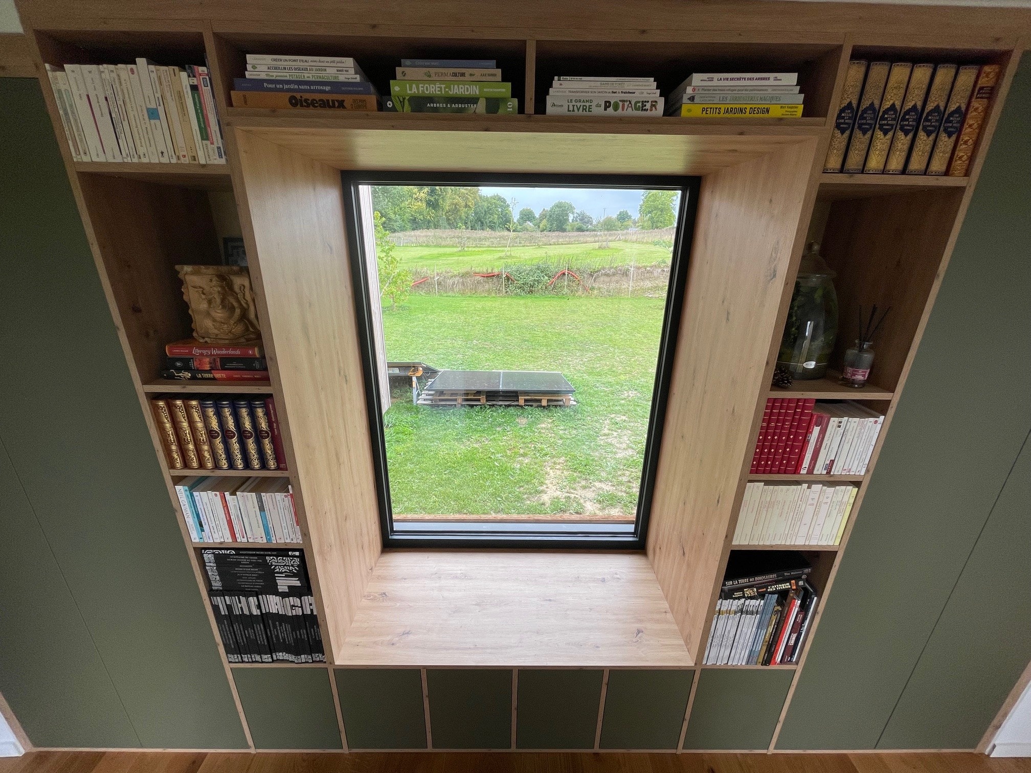 La bibliothèque ne vient pas se poser contre le mur, elle l'habille. L'ouverture est alors mise en valeur, encadrée comme un élément important de la pièce, et non plus comme une simple interruption.