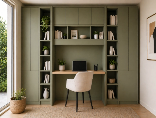 C'est souvent le choix du mobilier qui conditionne la réussite d'un espace hybride. Un bureau ajouté après coup donne souvent l'impression d'un élément rapporté. À l'inverse, un bureau sur-mesure intégré dans un meuble crée une continuité naturelle.